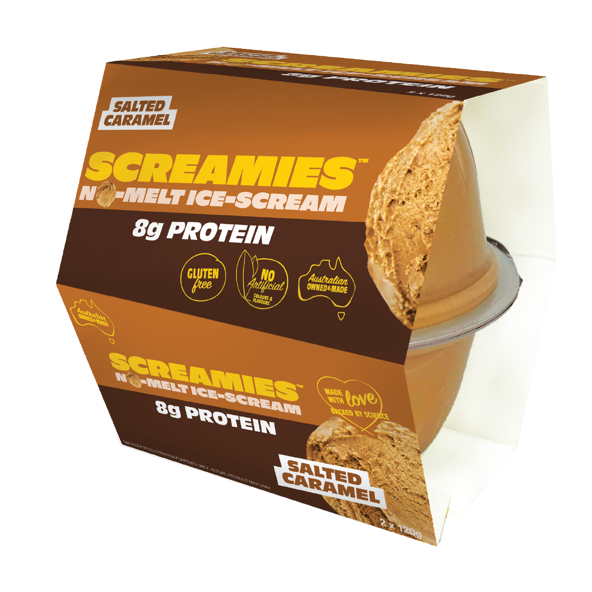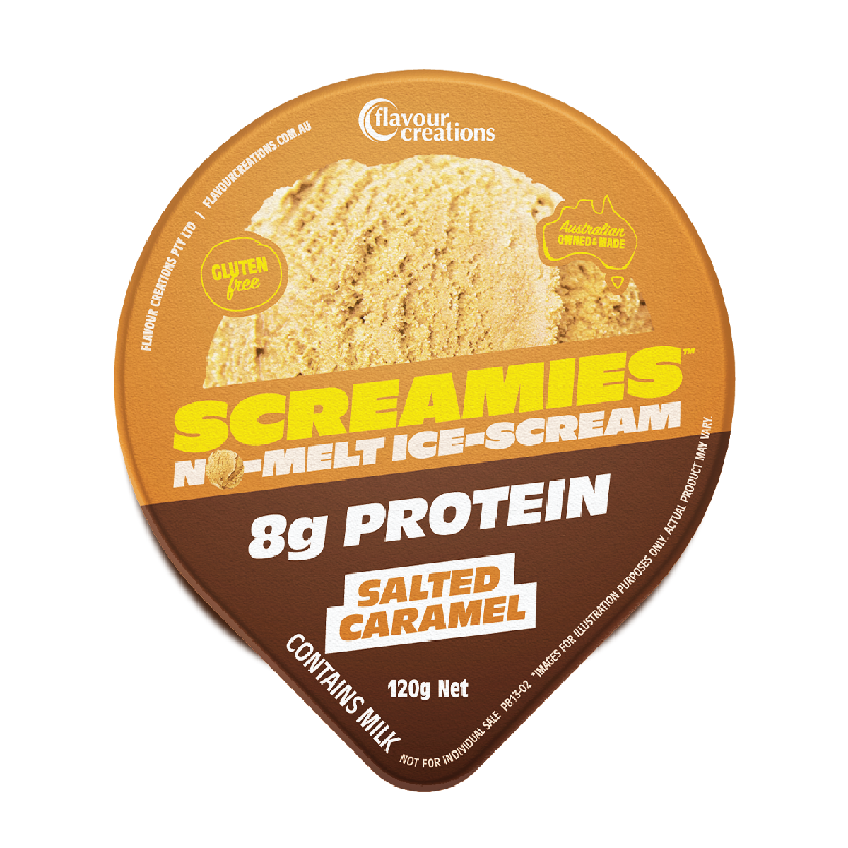 SCREAMIES 8g Protein Salted Caramel No-Melt Ice-Scream is made with real Aussie cream and packed with 8g of protein.